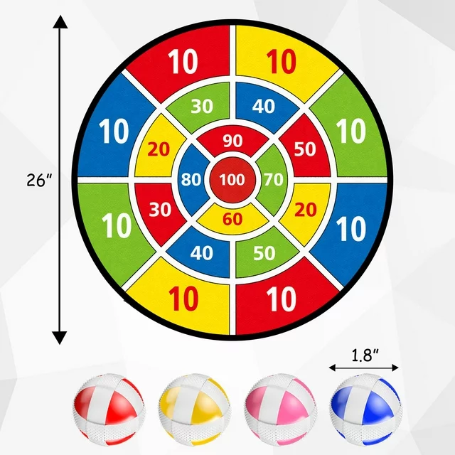 •  1.8" SUPERSIZE STICKY BALLS: You will realize that a large sticky ball can create a joyous atmosphere for the party. Each darts board set contains 16 colorful sticky balls (4 blues & 4 reds & 4 yellows & 4 pinks). High quality and safe hook-and-loop ball ensures that the ball can be 100% firmly attached to the board.