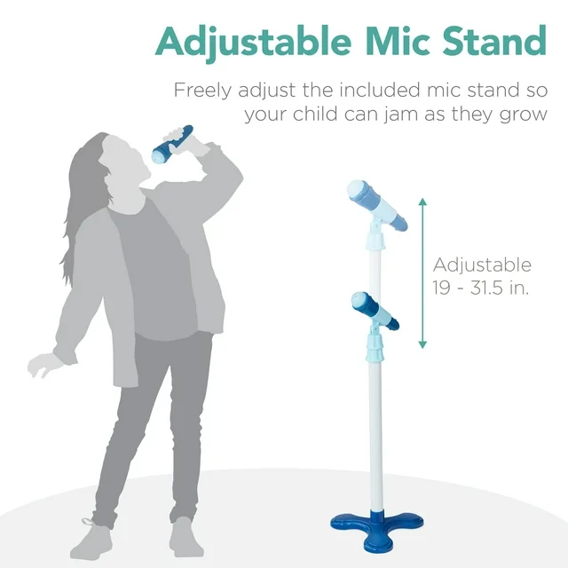 • ADJUSTABLE MIC STAND: Raise and lower the microphone stand to fit children of all sizes and help them perform as they grow up; OVERALL DIMENSIONS: 19"(L) x 7.5"(W) x 1.75"(H)