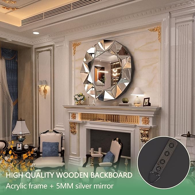 • ?【EXQUISITE WORKMANSHIP】The decorative mirror is designed with customized small triangular silver mirror around the rim. Each edge is carefully beveled to not only ensure safety, but also enhance the beauty of the mirror. It is sleek, modern and clean in the light.