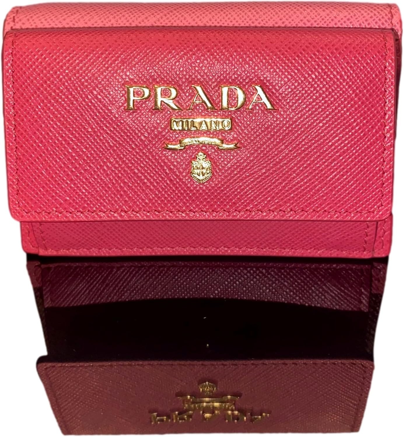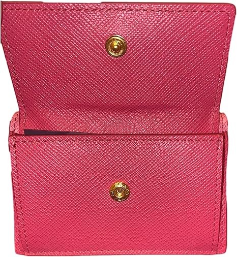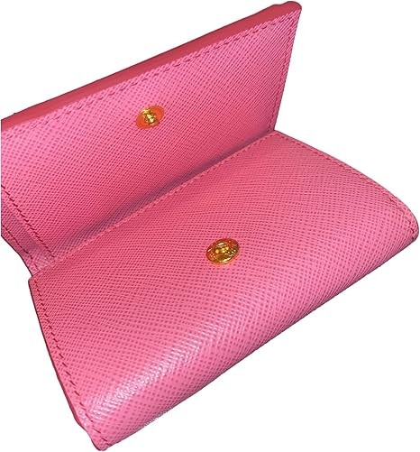 • This classic Prada womens trifold envelope wallet is beautiful inside and out. Crafted in pink saffiano leather the attention to detail is in the clean lines and minimal hardware. This trifold leather wallet features an envelope flap opens to a coin pouch with the iconic gold Prada metal emblem on the front.