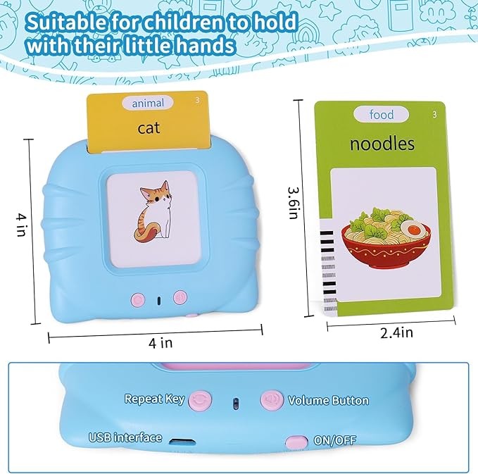 • 【Toddler Learning Toys】This speech therapy toy includes a card reader and 255 double sided flash cards, 510 sight words, covering 31 themes like ABC letters, numbers, vehicles, foods, animals, vegetable, etc.
