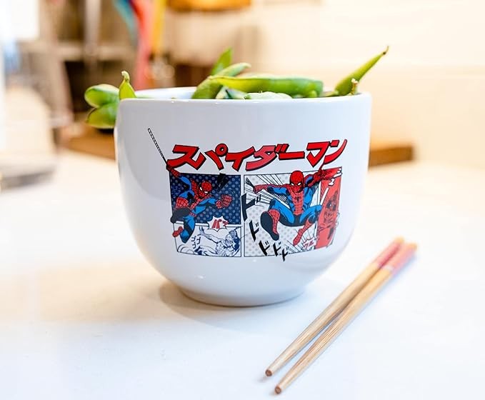 • RAMEN BOWL: Enjoy your ramen using this awesome Marvel Spiderman Ceramic Ramen Bowl with Chopsticks. Featuring Spiderman Manga Panels with Japanese writing that says "Spiderman" against a White background