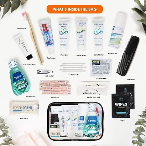 • Essential Travel-Size Toiletries and Accessories! Travel light with our TrekTote kit. Stay fresh and prepared with grooming and oral care essentials, conveniently packed for your journey. From grooming supplies to oral care necessities, everything you need is within reach.